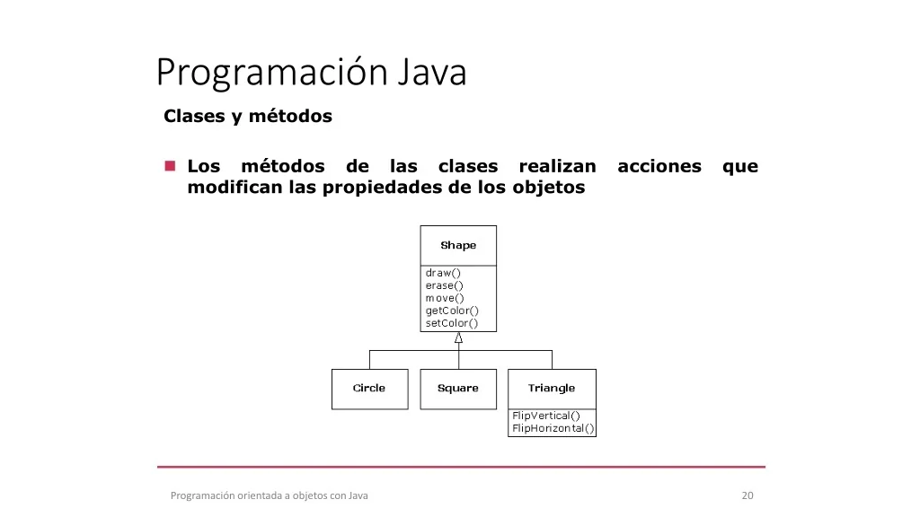 ProgramaciónJava Clases ymétodos • Los métodosdelasclasesrealizan modifican las propiedades de losobjetos accionesque Programación orientada a objetos conJava