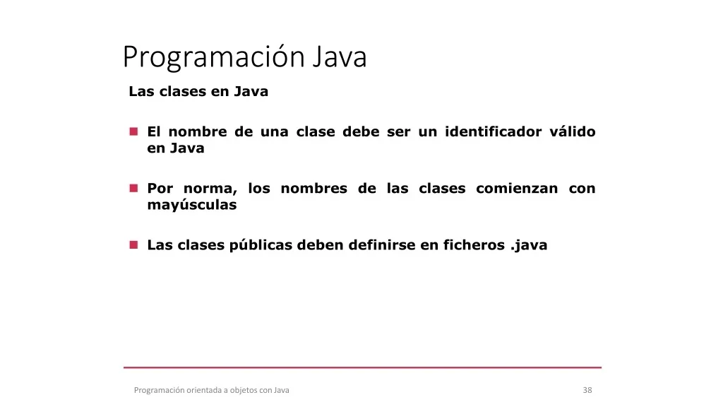 ProgramaciónJava • Las clases enJava • El nombrede una clase debe ser unidentificador válido enJava • Pornorma,losnombresde lasclasescomienzancon mayúsculas • Las clases públicas deben definirse en ficheros.java Programación orientada a objetos conJava
