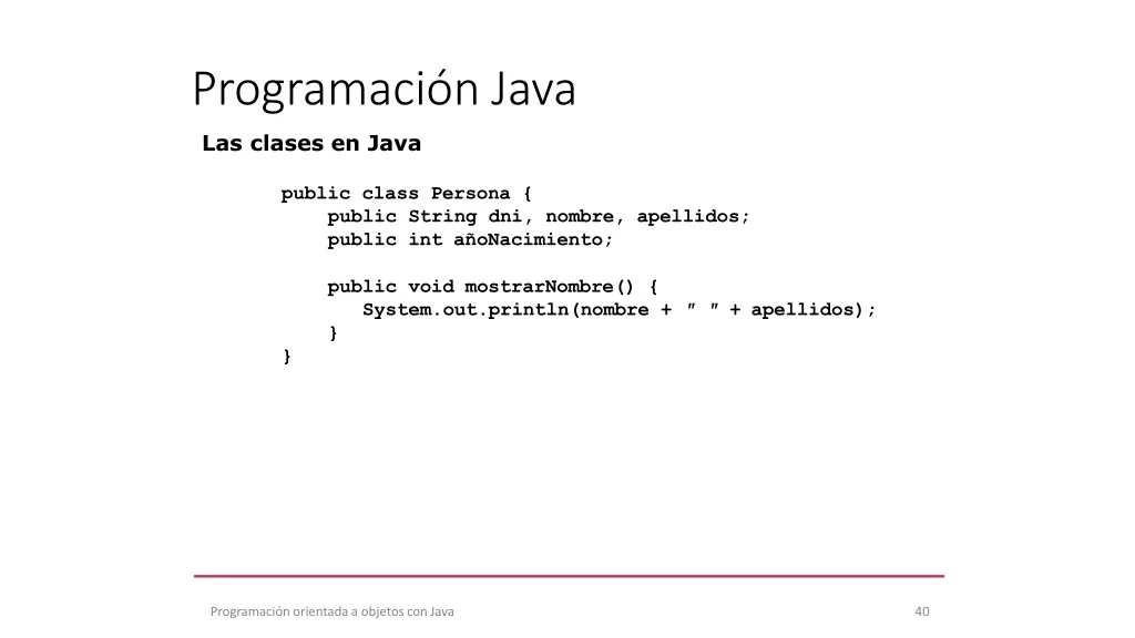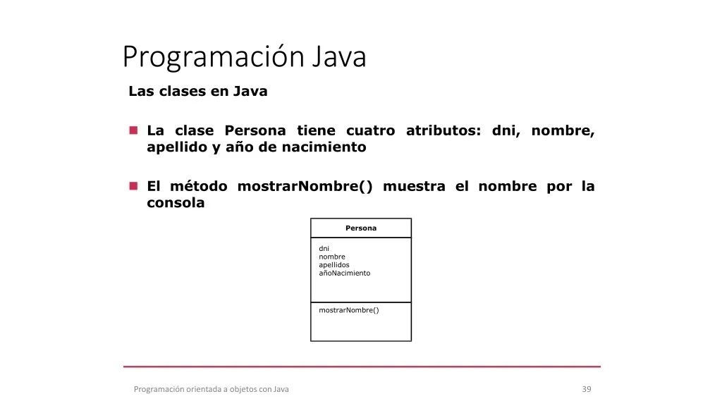 ProgramaciónJava Las clases enJava public class Persona{ public String dni, nombre,apellidos; public intañoNacimiento; public void mostrarNombre() { System.out.println(nombre + ″ ″ +apellidos); } } Programación orientada a objetos conJava
