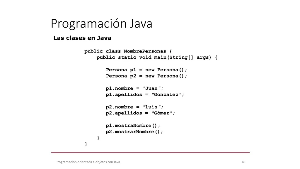 ProgramaciónJava Las clases enJava public class NombrePersonas{ public static void main(String[] args){ Persona p1 = newPersona(); Persona p2 = newPersona(); p1.nombre = ″Juan″; p1.apellidos =″Gonzalez″; p2.nombre = ″Luis″; p2.apellidos =″Gómez″; p1.mostraNombre(); p2.mostrarNombre(); } } Programación orientada a objetos conJava