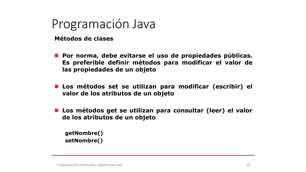 ProgramaciónJava • Métodos declases • Por norma, debe evitarse el uso de propiedades públicas. Es preferible definir métodos para modificar el valor de las propiedades de unobjeto • Los métodos set se utilizan para modificar (escribir) el valor de los atributos de unobjeto • Los métodos get se utilizan para consultar (leer) el valor de los atributos de unobjeto • getNombre() setNombre() Programación orientada a objetos conJava