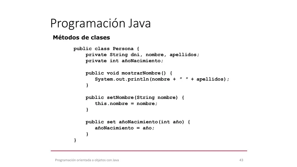 ProgramaciónJava Métodos declases public class Persona{ private String dni, nombre, apellidos; private intañoNacimiento; public void mostrarNombre() { System.out.println(nombre + ″ ″ +apellidos); } public setNombre(String nombre) { this.nombre =nombre; } public set añoNacimiento(int año){ añoNacimiento = año; } } Programación orientada a objetos conJava