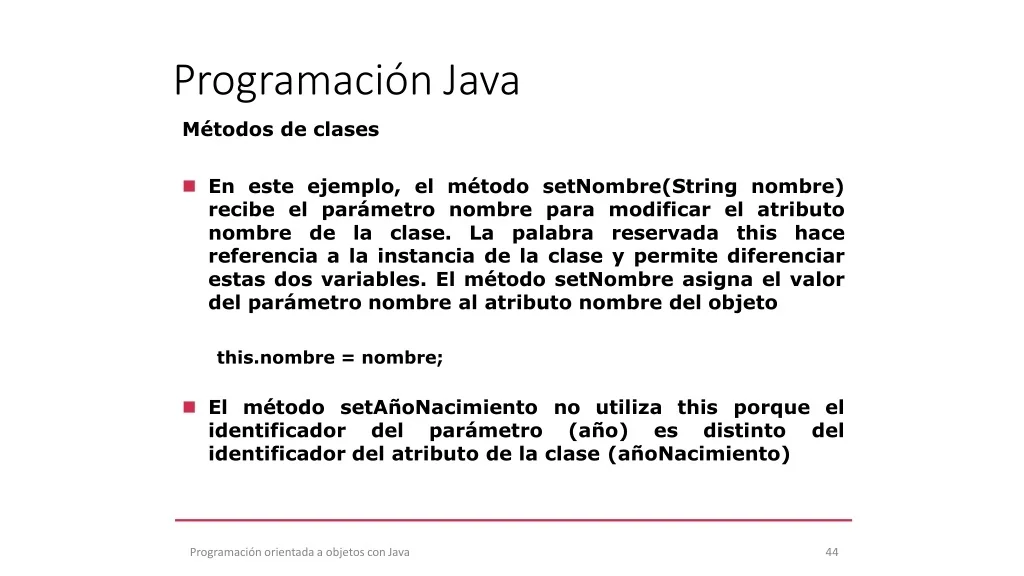 ProgramaciónJava • Métodos declases • En este ejemplo, el método setNombre(String nombre) recibe el parámetro nombre para modificar el atributo nombre de la clase. La palabra reservada this hace referencia a la instancia de la clase y permite diferenciar estas dos variables. El método setNombre asigna el valor del parámetro nombre al atributo nombre delobjeto • this.nombre =nombre; porque el del • El método setAñoNacimiento no utiliza this identificador del parámetro (año)esdistinto identificador del atributo de la clase(añoNacimiento) Programación orientada a objetos conJava