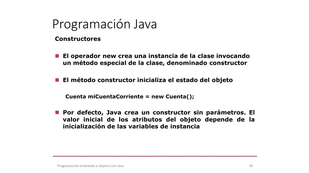 ProgramaciónJava • Constructores • El operador new crea una instancia de la clase invocando un método especial de la clase, denominadoconstructor • El método constructor inicializa el estado delobjeto • Cuenta miCuentaCorriente = newCuenta(); • Por defecto, Java crea un constructor sin parámetros. El valor inicial de los atributos del objeto depende dela inicialización de las variables deinstancia Programación orientada a objetos conJava