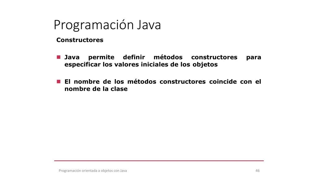 ProgramaciónJava Constructores • Java permite definir métodos constructores especificar los valores iniciales de losobjetos para • El nombrede los métodosconstructorescoincide conel nombre de la clase Programación orientada a objetos conJava