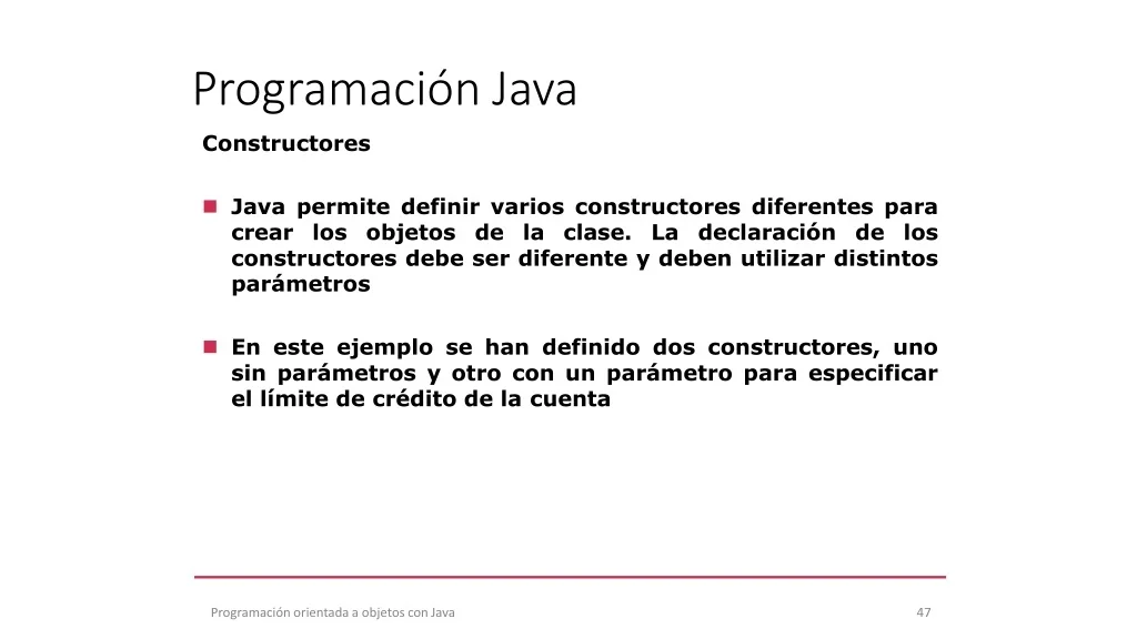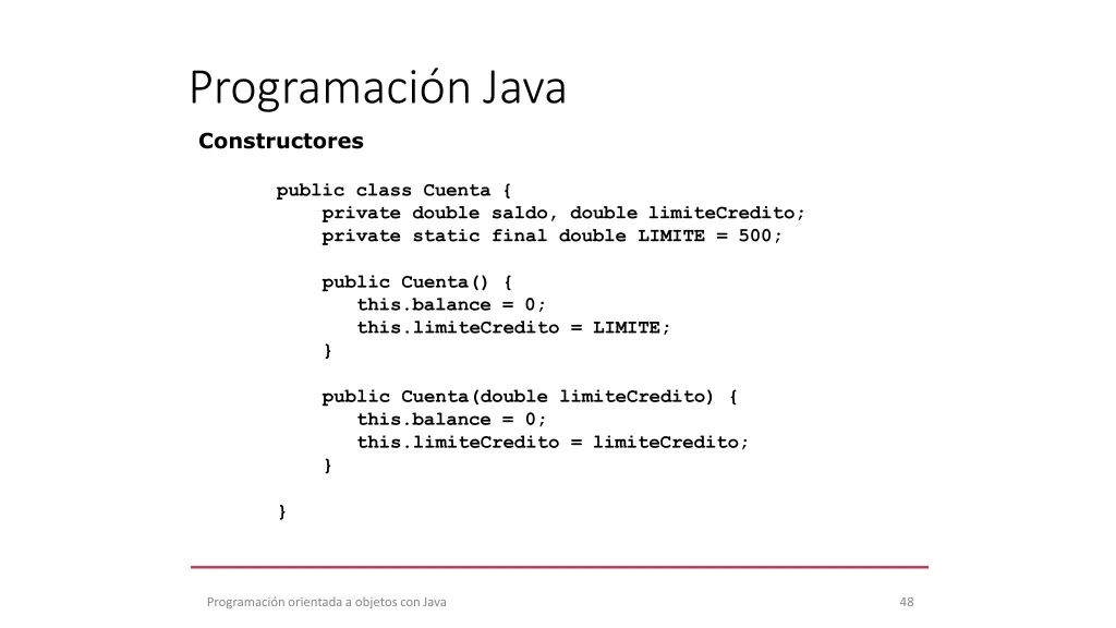 ProgramaciónJava Constructores public class Cuenta{ private double saldo, doublelimiteCredito; private static final double LIMITE =500; public Cuenta() { this.balance =0; this.limiteCredito =LIMITE; } public Cuenta(double limiteCredito) { this.balance = 0; this.limiteCredito =limiteCredito; } } Programación orientada a objetos conJava