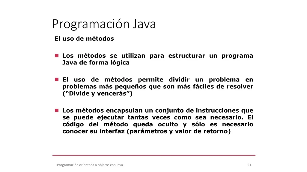 ProgramaciónJava • El uso demétodos • Los métodos se utilizan para estructurar un programa Java de formalógica • El uso de métodos permite dividir un problema en problemas más pequeños que son más fáciles de resolver (“Divide y vencerás”) • Los métodos encapsulan un conjunto de instrucciones que se puede ejecutar tantas veces como sea necesario. El código del método queda oculto y sólo es necesario conocer su interfaz (parámetros y valor deretorno) Programación orientada a objetos conJava