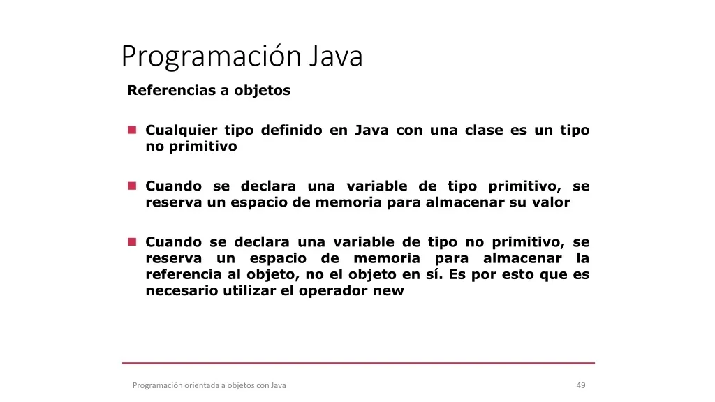 ProgramaciónJava • Referencias aobjetos • Cualquier tipo definido en Java con una clase es un tipo noprimitivo • Cuando se declara una variable de tipo primitivo, se reserva un espacio de memoria para almacenar suvalor • Cuando se declara una variable de tipo no primitivo, se reserva un espacio de memoria para almacenar la referencia al objeto, no el objeto en sí. Es por esto que es necesario utilizar el operadornew Programación orientada a objetos conJava