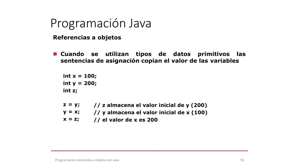 ProgramaciónJava • Referencias aobjetos • Cuandoseutilizantiposdedatosprimitivoslas sentencias de asignación copian el valor de lasvariables • int x =100; int y =200; intz; z = y; y =x; x =z; // z almacena el valor inicial de y(200) // y almacena el valor inicial de x(100) // el valor de x es200 Programación orientada a objetos conJava