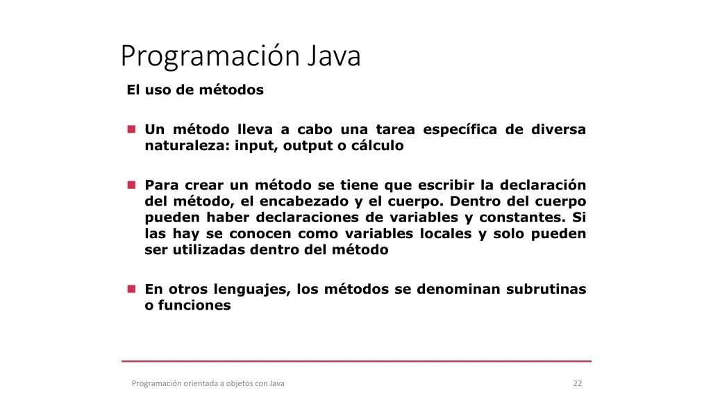 ProgramaciónJava • El uso demétodos • Un método lleva a cabo una tarea específica de diversa naturaleza: input, output o cálculo • Para crear un método se tiene que escribir la declaración del método, el encabezado y el cuerpo. Dentro del cuerpo pueden haber declaraciones de variables y constantes. Si las hay se conocen como variables locales y solo pueden ser utilizadas dentro delmétodo • En otros lenguajes, los métodos se denominan subrutinas ofunciones Programación orientada a objetos conJava