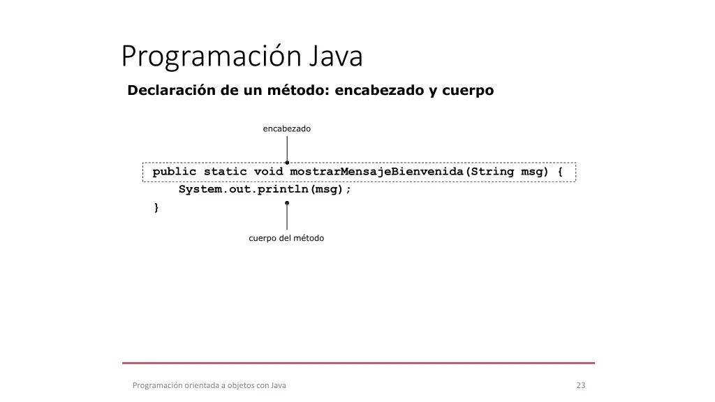 ProgramaciónJava Declaración de un método: encabezado ycuerpo encabezado public static void mostrarMensajeBienvenida(String msg){ System.out.println(msg); } cuerpo delmétodo Programación orientada a objetos conJava
