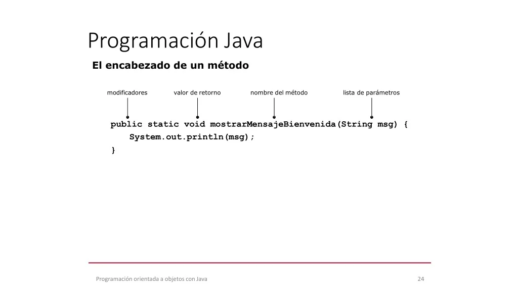 ProgramaciónJava El encabezado de unmétodo modificadores valor deretorno nombre delmétodo lista deparámetros public static void mostrarMensajeBienvenida(String msg){ System.out.println(msg); } Programación orientada a objetos conJava