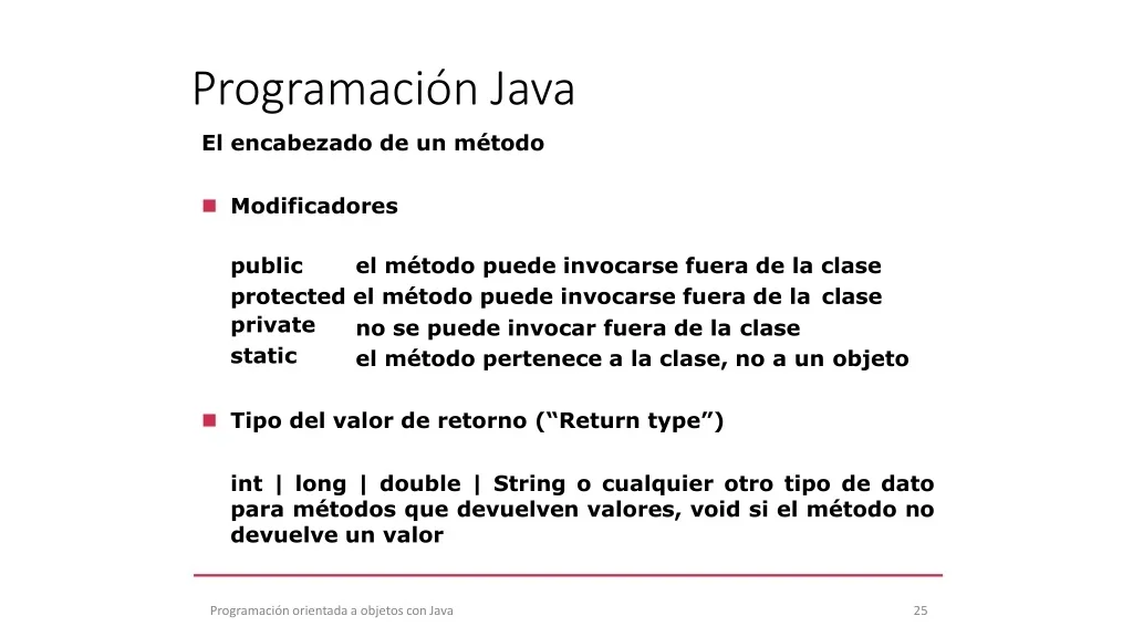 ProgramaciónJava • El encabezado de unmétodo • Modificadores • public el método puede invocarse fuera de la clase protected el método puede invocarse fuera de laclase private static no se puede invocar fuera de laclase el método pertenece a la clase, no a unobjeto • Tipo del valor de retorno (“Returntype”) • int | long | double | String o cualquier otro tipo de dato para métodos que devuelven valores, void si el método no devuelve unvalor Programación orientada a objetos conJava
