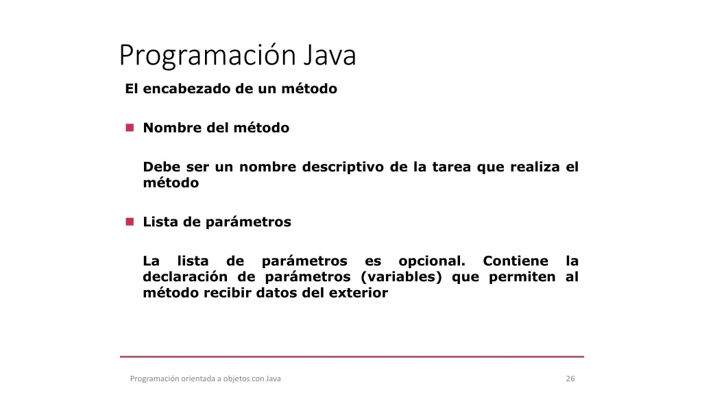 ProgramaciónJava • El encabezado de unmétodo • Nombre delmétodo • Debe ser un nombre descriptivo de la tarea que realiza el método • Lista deparámetros • La lista de parámetros es opcional. Contiene la declaración de parámetros (variables) que permiten al método recibir datos delexterior Programación orientada a objetos conJava