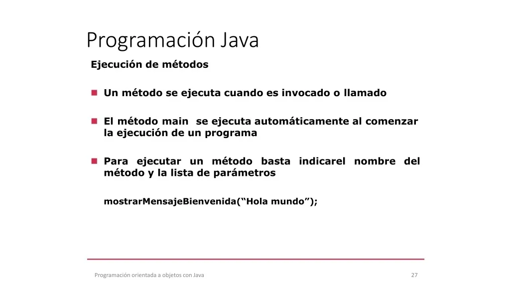 ProgramaciónJava • Ejecución de métodos • Un método se ejecuta cuando es invocado ollamado • Elmétodomain se ejecuta automáticamente al comenzar la ejecución de unprograma • Para ejecutarun método basta indicarel nombredel método y la lista deparámetros • mostrarMensajeBienvenida(“Holamundo”); Programación orientada a objetos conJava