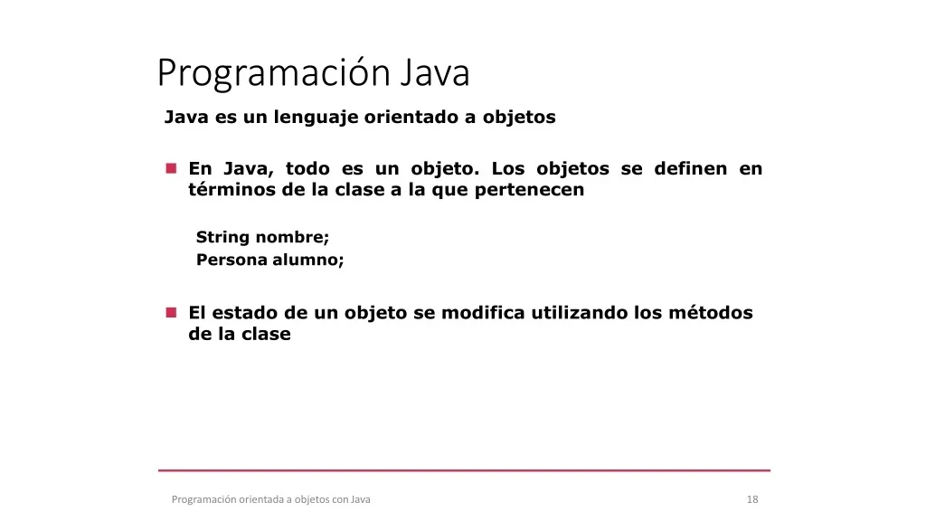 ProgramaciónJava • Java es un lenguaje orientado aobjetos • EnJava,todo esunobjeto. Losobjetosse definenen términos de la clase a la quepertenecen • String nombre; Personaalumno; • El estado de un objeto se modifica utilizando los métodos de laclase Programación orientada a objetos conJava
