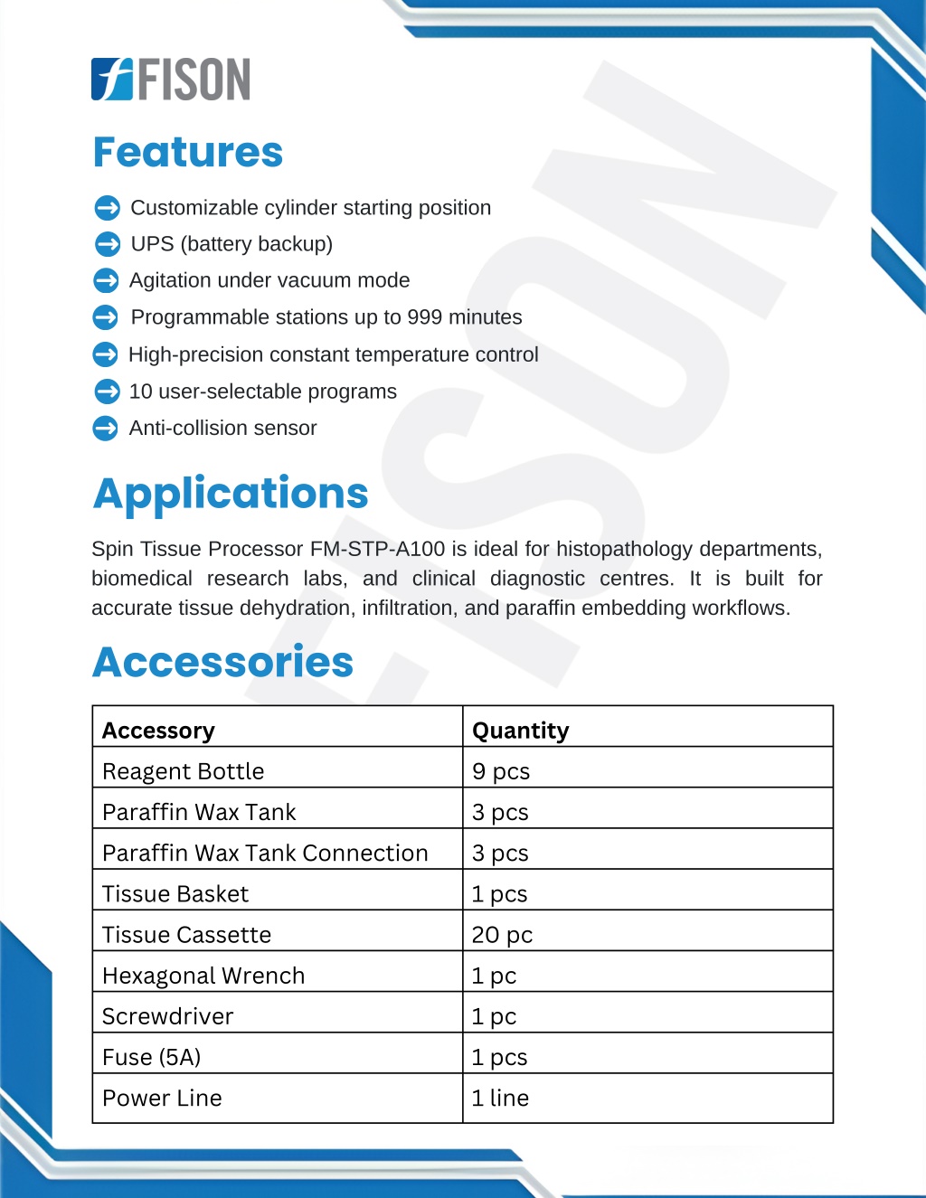 Features Customizable cylinder starting position UPS (battery backup) Agitation under vacuum mode Programmable stations up to 999 minutes High-precision constant temperature control 10 user-selectable programs Anti-collision sensor Applications Spin Tissue Processor FM-STP-A100 is ideal for histopathology departments, biomedical research labs, and clinical diagnostic centres. It is built for accurate tissue dehydration, infiltration, and paraffin embedding workflows. Accessories Accessory Reagent Bottle Paraffin Wax Tank Paraffin Wax Tank Connection Tissue Basket Tissue Cassette Hexagonal Wrench Screwdriver Fuse (5A) Power Line Quantity 9 pcs 3 pcs 3 pcs 1 pcs 20 pc 1 pc 1 pc 1 pcs 1 line