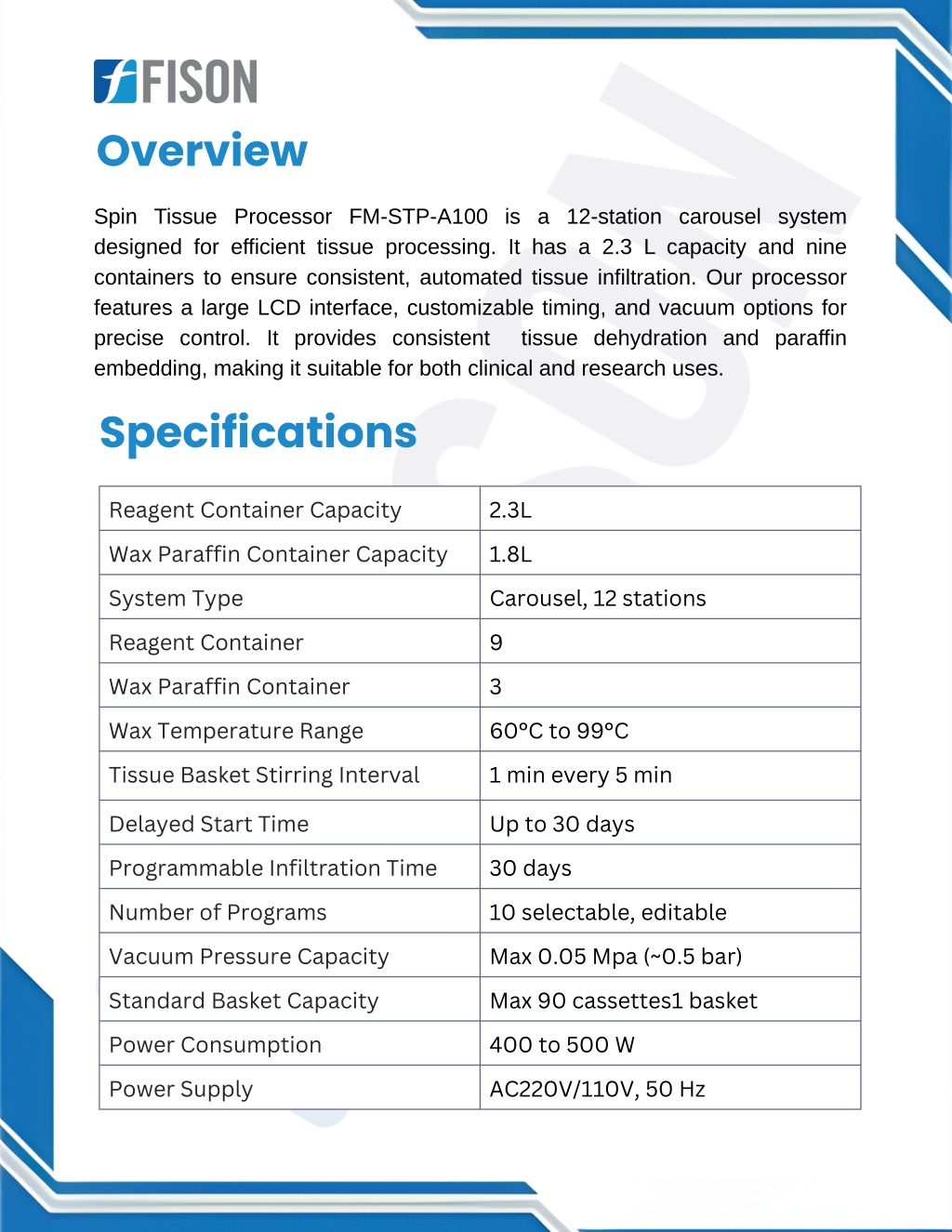 Overview Spin Tissue Processor FM-STP-A100 is a 12-station carousel system designed for efficient tissue processing. It has a 2.3 L capacity and nine containers to ensure consistent, automated tissue infiltration. Our processor features a large LCD interface, customizable timing, and vacuum options for precise control. It provides consistent tissue dehydration and paraffin embedding, making it suitable for both clinical and research uses. Specifications Reagent Container Capacity 2.3L Wax Paraffin Container Capacity 1.8L System Type Carousel, 12 stations Reagent Container 9 Wax Paraffin Container 3 Wax Temperature Range 60°C to 99°C Tissue Basket Stirring Interval 1 min every 5 min Delayed Start Time Up to 30 days Programmable Infiltration Time 30 days Number of Programs 10 selectable, editable Vacuum Pressure Capacity Max 0.05 Mpa (~0.5 bar) Standard Basket Capacity Max 90 cassettes1 basket Power Consumption 400 to 500 W Power Supply AC220V/110V, 50 Hz