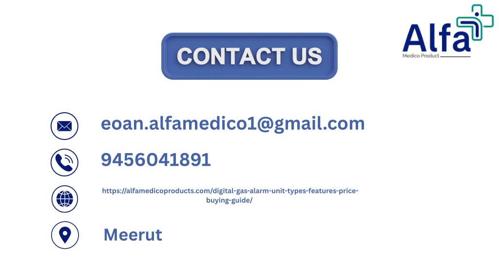 eoan.alfamedico1@gmail.com 9456041891 https://alfamedicoproducts.com/digital-gas-alarm-unit-types-features-price- buying-guide/ Meerut