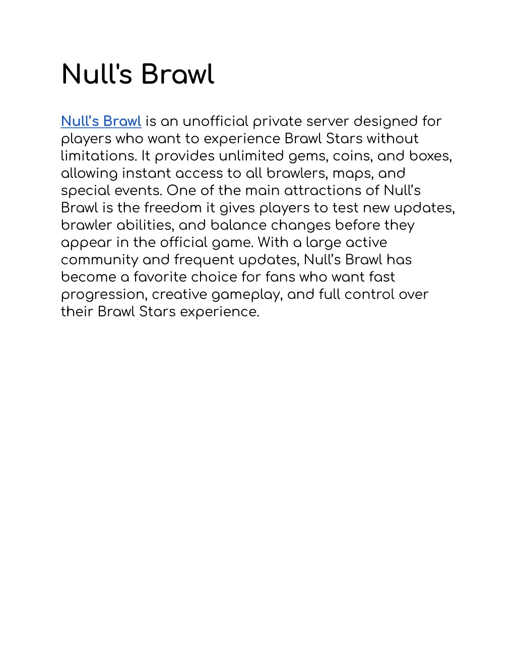 Null's Brawl Null’s Brawl is an unofficial private server designed for players who want to experience Brawl Stars without limitations. It provides unlimited gems, coins, and boxes, allowing instant access to all brawlers, maps, and special events. One of the main attractions of Null’s Brawl is the freedom it gives players to test new updates, brawler abilities, and balance changes before they appear in the official game. With a large active community and frequent updates, Null’s Brawl has become a favorite choice for fans who want fast progression, creative gameplay, and full control over their Brawl Stars experience.