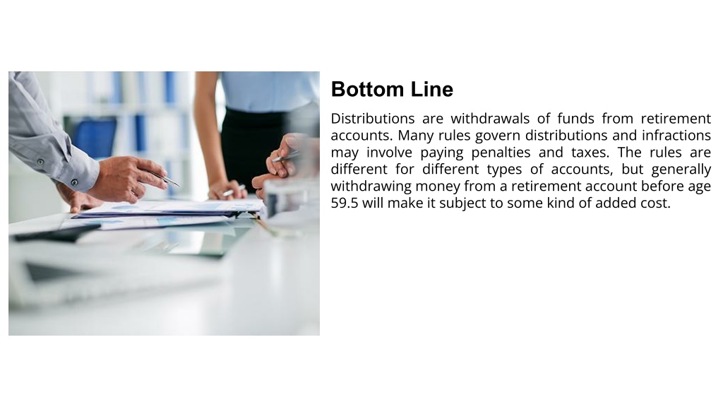 6. Bottom Line Distributions are withdrawals of funds from retirement accounts. Many rules govern distributions and infractions may involve paying penalties and taxes. The rules are different for different types of accounts, but generally withdrawing money from a retirement account before age 59.5 will make it subject to some kind of added cost.