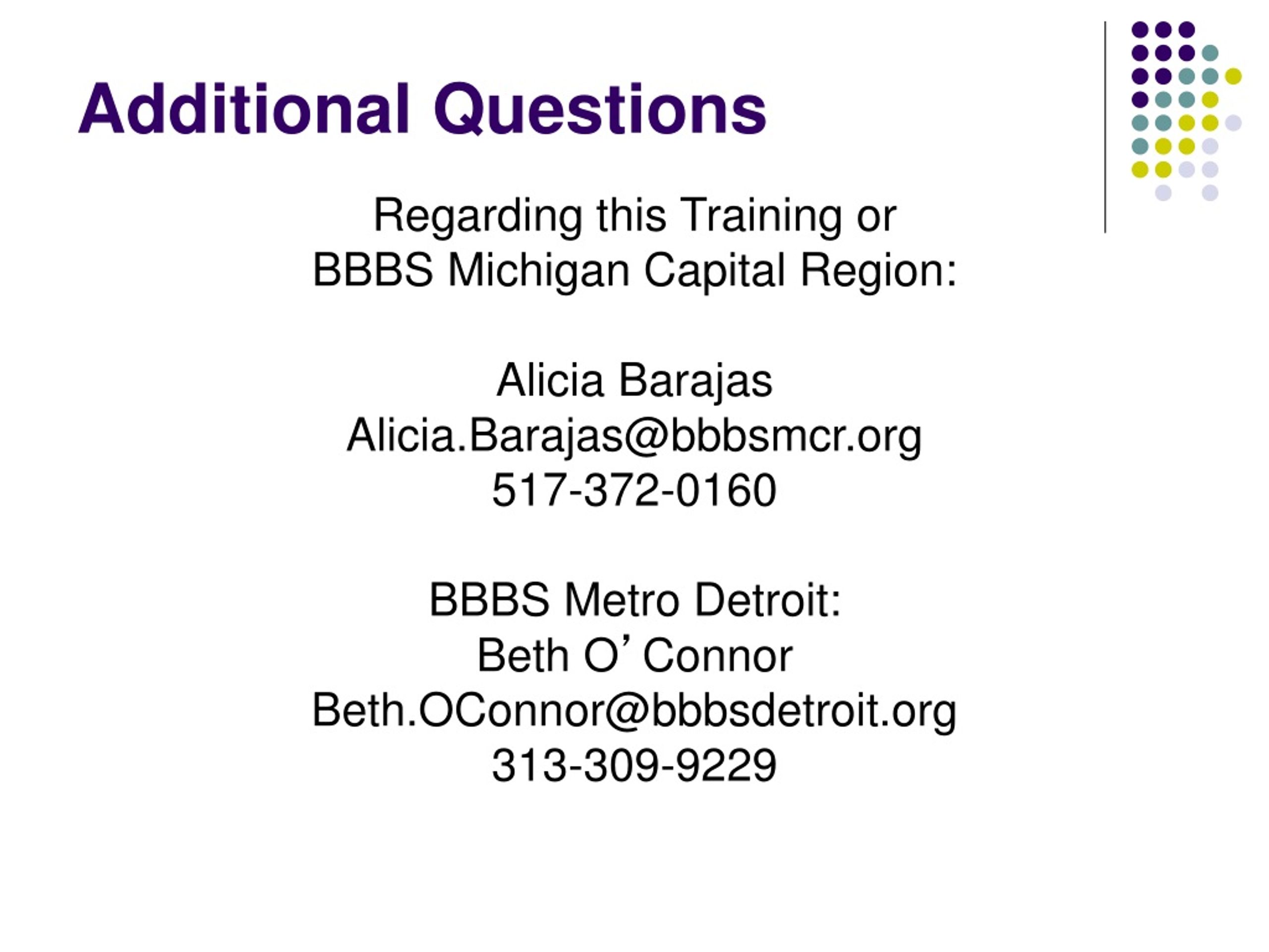 Additional Questions Regarding this Training or BBBS Michigan Capital Region: Alicia Barajas Alicia.Barajas@bbbsmcr.org 517-372-0160 BBBS Metro Detroit: Beth O’Connor Beth.OConnor@bbbsdetroit.org 313-309-9229