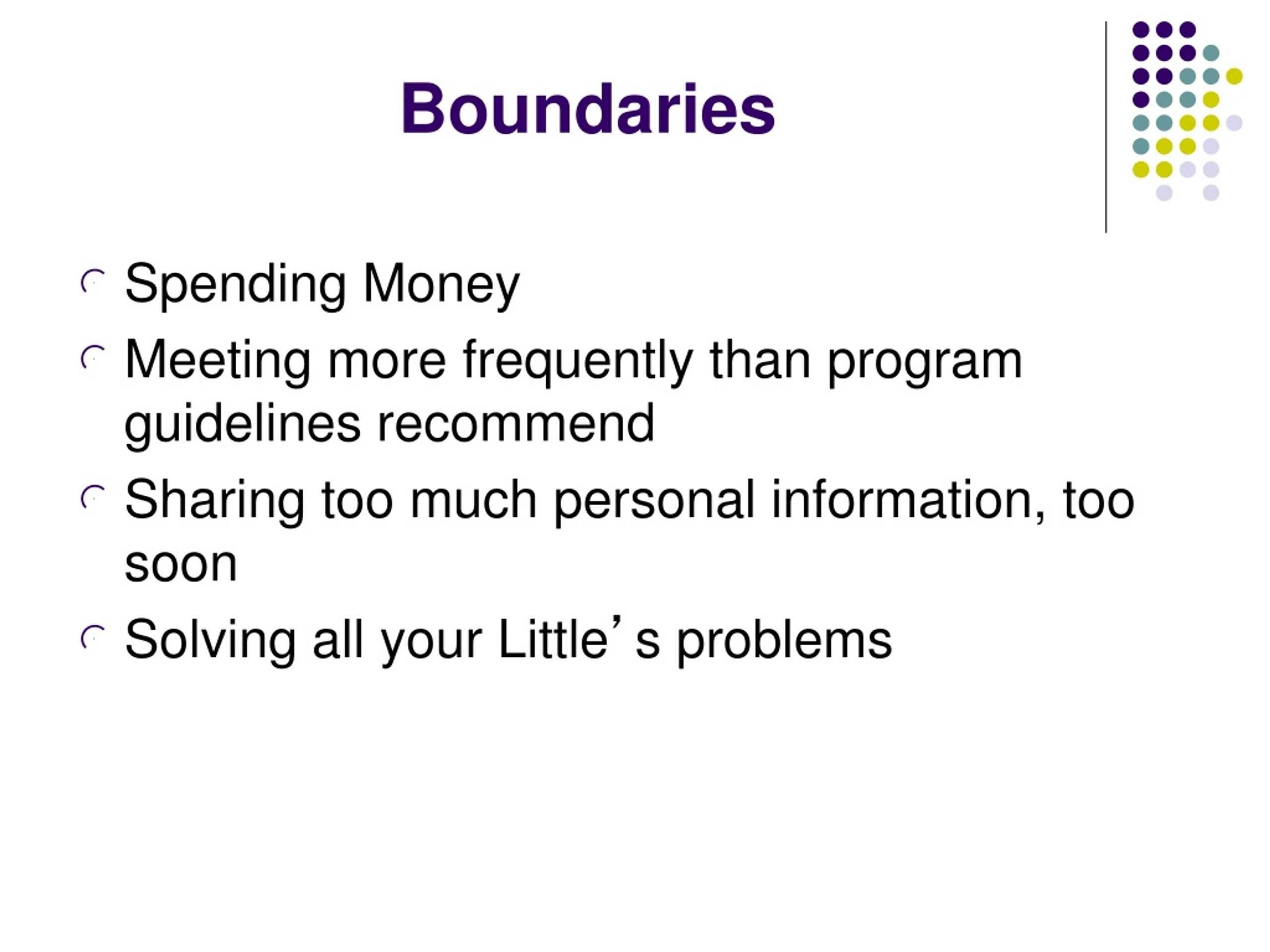 Boundaries Spending Money Meeting more frequently than program guidelines recommend Sharing too much personal information, too soon Solving all your Little’s problems