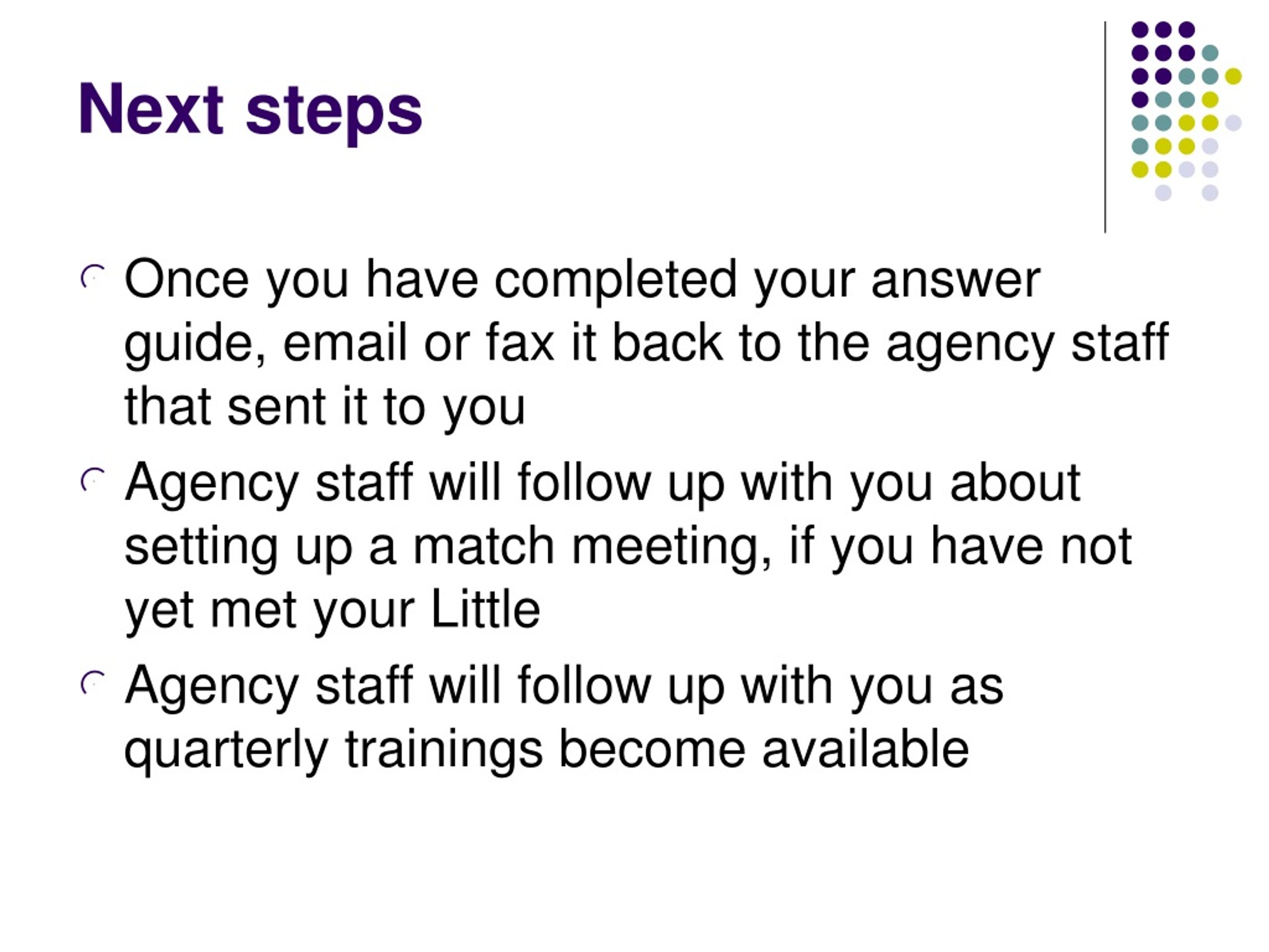 Next steps Once you have completed your answer guide, email or fax it back to the agency staff that sent it to you Agency staff will follow up with you about setting up a match meeting, if you have not yet met your Little Agency staff will follow up with you as quarterly trainings become available