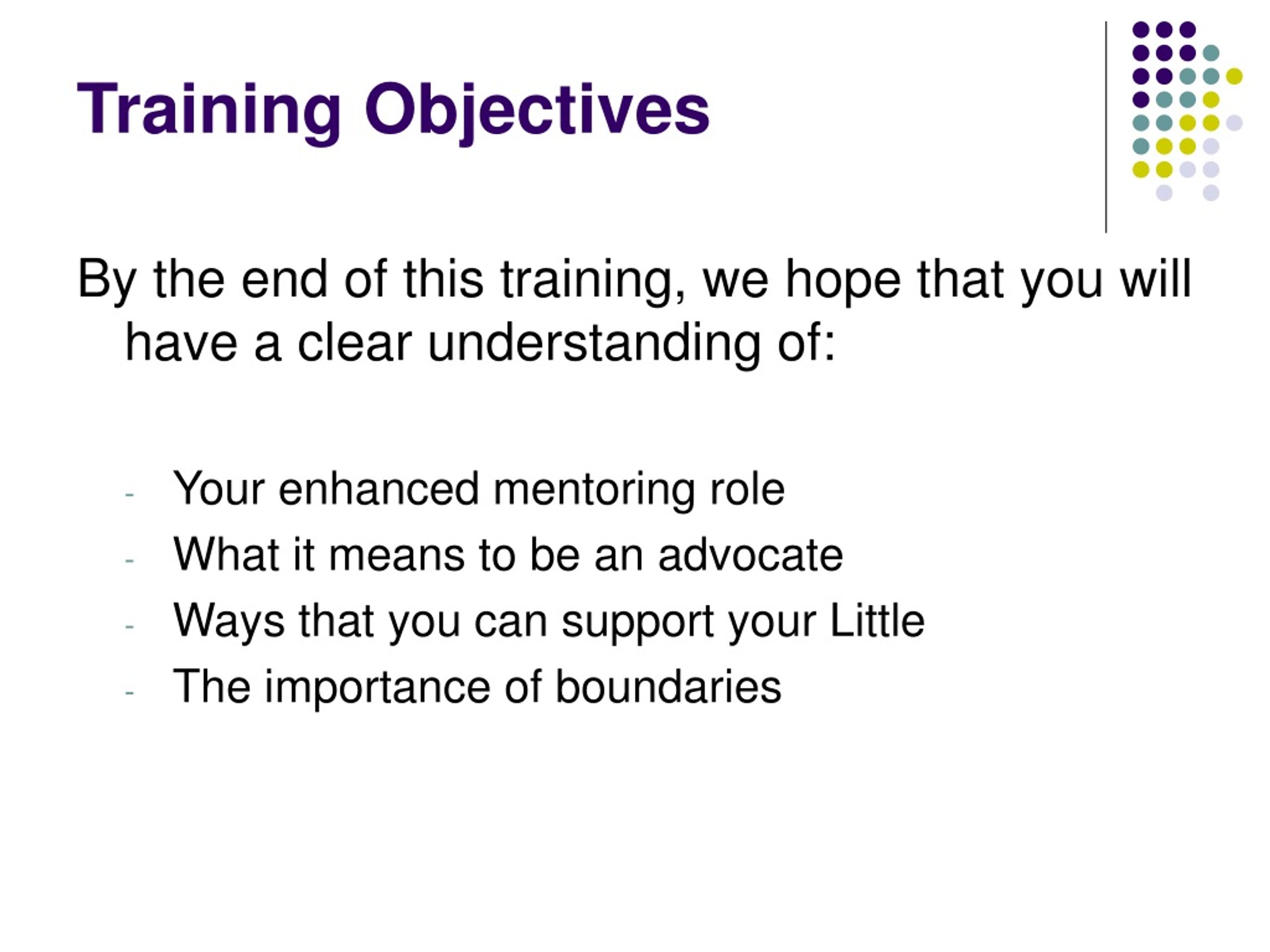 Training Objectives By the end of this training, we hope that you will have a clear understanding of: Your enhanced mentoring role What it means to be an advocate Ways that you can support your Little The importance of boundaries
