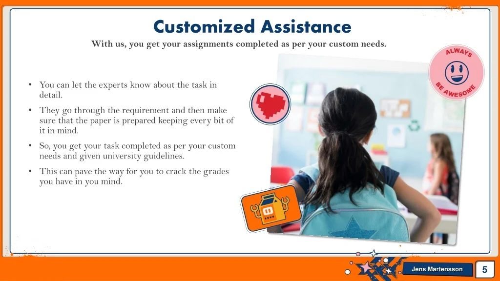Customized Assistance With us, you get your assignments completed as per your custom needs. • You can let the experts know about the task in detail. • They go through the requirement and then make sure that the paper is prepared keeping every bit of it in mind. • So, you get your task completed as per your custom needs and given university guidelines. • This can pave the way for you to crack the grades you have in you mind.