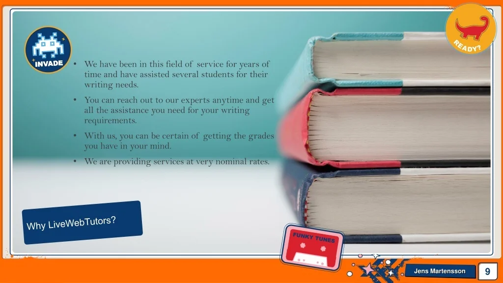 Large image slide FUNKY TUNES • We have been in this field of service for years of time and have assisted several students for their writing needs. • You can reach out to our experts anytime and get all the assistance you need for your writing requirements. • With us, you can be certain of getting the grades you have in your mind. • We are providing services at very nominal rates. Why LiveWebTutors?