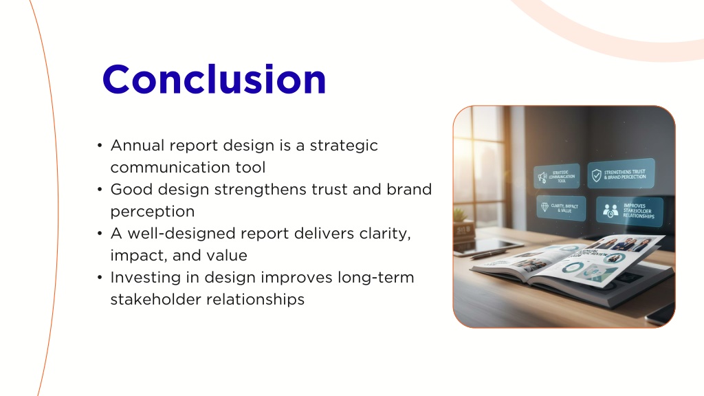 Conclusion • Annual report design is a strategic communication tool • Good design strengthens trust and brand perception • A well-designed report delivers clarity, impact, and value • Investing in design improves long-term stakeholder relationships