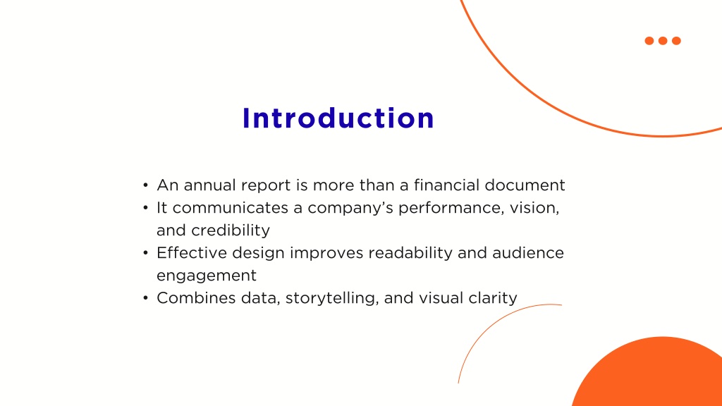 Introduction • An annual report is more than a financial document • It communicates a company’s performance, vision, and credibility • Effective design improves readability and audience engagement • Combines data, storytelling, and visual clarity