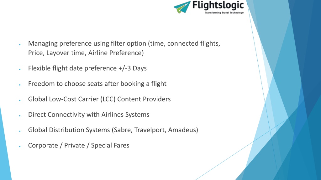Managing preference using filter option (time, connected flights, Price, Layover time, Airline Preference) • Flexible flight date preference +/-3 Days • Freedom to choose seats after booking a flight • Global Low-Cost Carrier (LCC) Content Providers • Direct Connectivity with Airlines Systems • Global Distribution Systems (Sabre, Travelport, Amadeus) • Corporate / Private / Special Fares