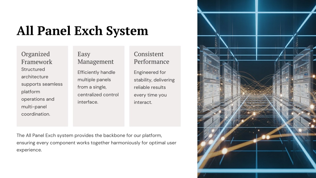All Panel Exch System Organized Framework Structured architecture supports seamless platform operations and multi-panel coordination. Easy Management Consistent Performance Efficiently handle multiple panels from a single, centralized control interface. Engineered for stability, delivering reliable results every time you interact. The All Panel Exch system provides the backbone for our platform, ensuring every component works together harmoniously for optimal user experience.