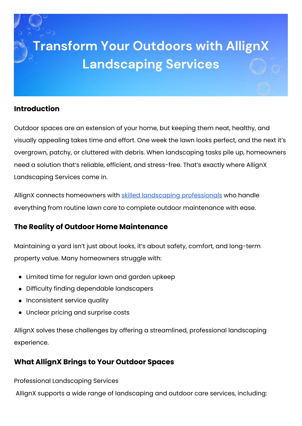 Introduction Outdoor spaces are an extension of your home, but keeping them neat, healthy, and visually appealing takes time and effort. One week the lawn looks perfect, and the next it’s overgrown, patchy, or cluttered with debris. When landscaping tasks pile up, homeowners need a solution that’s reliable, efficient, and stress-free. That’s exactly where AllignX Landscaping Services come in. AllignX connects homeowners with skilled landscaping professionals who handle everything from routine lawn care to complete outdoor maintenance with ease. The Reality of Outdoor Home Maintenance Maintaining a yard isn’t just about looks, it’s about safety, comfort, and long-term property value. Many homeowners struggle with: Limited time for regular lawn and garden upkeep Difficulty finding dependable landscapers Inconsistent service quality Unclear pricing and surprise costs AllignX solves these challenges by offering a streamlined, professional landscaping experience. What AllignX Brings to Your Outdoor Spaces Professional Landscaping Services AllignX supports a wide range of landscaping and outdoor care services, including: