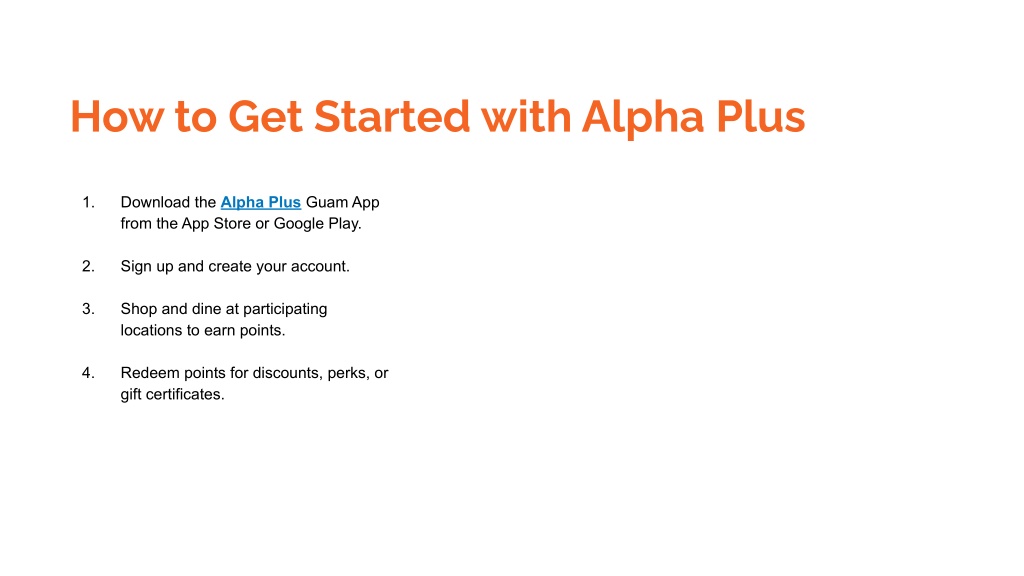 2. How to Get Started with Alpha Plus 1. Download the Alpha Plus Guam App from the App Store or Google Play. 2. Sign up and create your account. 3. Shop and dine at participating locations to earn points. 4. Redeem points for discounts, perks, or gift certificates.