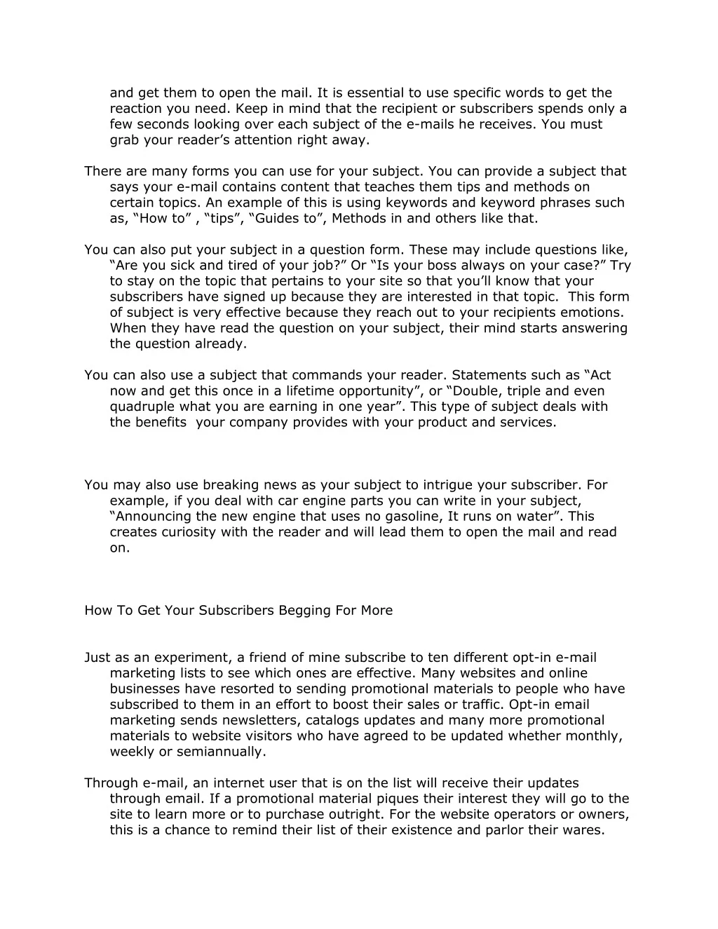 and get them to open the mail. It is essential to use specific words to get the reaction you need. Keep in mind that the recipient or subscribers spends only a few seconds looking over each subject of the e-mails he receives. You must grab your reader’s attention right away. There are many forms you can use for your subject. You can provide a subject that says your e-mail contains content that teaches them tips and methods on certain topics. An example of this is using keywords and keyword phrases such as, “How to” , “tips”, “Guides to”, Methods in and others like that. You can also put your subject in a question form. These may include questions like, “Are you sick and tired of your job?” Or “Is your boss always on your case?” Try to stay on the topic that pertains to your site so that you’ll know that your subscribers have signed up because they are interested in that topic. This form of subject is very effective because they reach out to your recipients emotions. When they have read the question on your subject, their mind starts answering the question already. You can also use a subject that commands your reader. Statements such as “Act now and get this once in a lifetime opportunity”, or “Double, triple and even quadruple what you are earning in one year”. This type of subject deals with the benefits your company provides with your product and services. You may also use breaking news as your subject to intrigue your subscriber. For example, if you deal with car engine parts you can write in your subject, “Announcing the new engine that uses no gasoline, It runs on water”. This creates curiosity with the reader and will lead them to open the mail and read on. How To Get Your Subscribers Begging For More Just as an experiment, a friend of mine subscribe to ten different opt-in e-mail marketing lists to see which ones are effective. Many websites and online businesses have resorted to sending promotional materials to people who have subscribed to them in an effort to boost their sales or traffic. Opt-in email marketing sends newsletters, catalogs updates and many more promotional materials to website visitors who have agreed to be updated whether monthly, weekly or semiannually. Through e-mail, an internet user that is on the list will receive their updates through email. If a promotional material piques their interest they will go to the site to learn more or to purchase outright. For the website operators or owners, this is a chance to remind their list of their existence and parlor their wares.