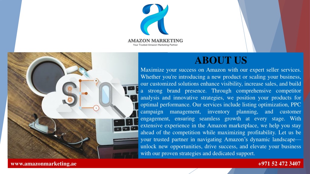 2. ABOUT US Maximize your success on Amazon with our expert seller services. Whether you're introducing a new product or scaling your business, our customized solutions enhance visibility, increase sales, and build a strong brand presence. Through comprehensive competitor analysis and innovative strategies, we position your products for optimal performance. Our services include listing optimization, PPC campaign management, inventory engagement, ensuring seamless growth at every stage. With extensive experience in the Amazon marketplace, we help you stay ahead of the competition while maximizing profitability. Let us be your trusted partner in navigating Amazon’s dynamic landscape— unlock new opportunities, drive success, and elevate your business with our proven strategies and dedicated support. planning, and customer www.amazonmarketing.ae +971 52 472 3407