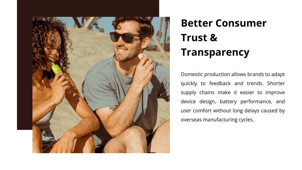 6. Better Consumer Trust & Transparency Domestic production allows brands to adapt quickly to feedback and trends. Shorter supply chains make it easier to improve device design, battery performance, and user comfort without long delays caused by overseas manufacturing cycles.