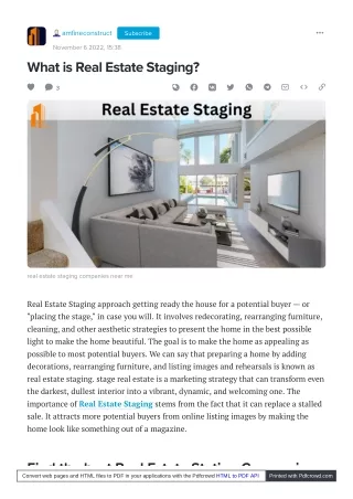 amfineconstruct Subscribe November 6 2022, 15:38 What is Real Estate Staging? 3 real estate staging companies near me Real Estate Staging approach getting ready the house for a potential buyer — or "placing the stage," in case you will. It involves redecorating, rearranging furniture, cleaning, and other aesthetic strategies to present the home in the best possible light to make the home beautiful. The goal is to make the home as appealing as possible to most potential buyers. We can say that preparing a home by adding decorations, rearranging furniture, and listing images and rehearsals is known as real estate staging. stage real estate is a marketing strategy that can transform even the darkest, dullest interior into a vibrant, dynamic, and welcoming one. The importance of Real Estate Staging stems from the fact that it can replace a stalled sale. It attracts more potential buyers from online listing images by making the home look like something out of a magazine. Fi d th b Convert web pages and HTML files to PDF in your applications with the Pdfcrowd HTML to PDF API t R l E t t St ti C i Printed with Pdfcrowd.com