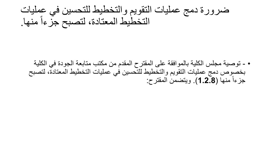10. ضرورة دمج عمليات التقويم والتخطيط للتحسين في عمليات التخطيط المعتادة، لتصبح جزءاً منها. • - توصية مجلس الكلية بالموافقة على المقترح المقدم من مكتب متابعة الجودة في الكلية بخصوص دمج عمليات التقويم والتخطيط للتحسين في عمليات التخطيط المعتادة، لتصبح جزءاً منها (1.2.8). ويتضمن المقترح: