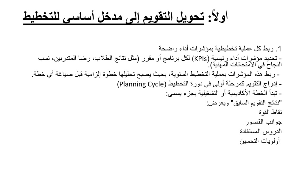 11. أولاً: تحويل التقويم إلى مدخل أساسي للتخطيط 1. ربط كل عملية تخطيطية بمؤشرات أداء واضحة - تحديد مؤشرات أداء رئيسية ((KPIs لكل برنامج أو مقرر (مثل نتائج الطلاب، رضا المتدربين، نسب النجاح في الامتحانات المهنية). - ربط هذه المؤشرات بعملية التخطيط السنوية، بحيث يصبح تحليلها خطوة إلزامية قبل صياغة أي خطة. - إدراج التقويم كمرحلة أولى في دورة التخطيط ((Planning Cycle - تبدأ الخطة الأكاديمية أو التشغيلية بجزء يسمى: "نتائج التقويم السابق" ويعرض: نقاط القوة جوانب القصور الدروس المستفادة أولويات التحسين