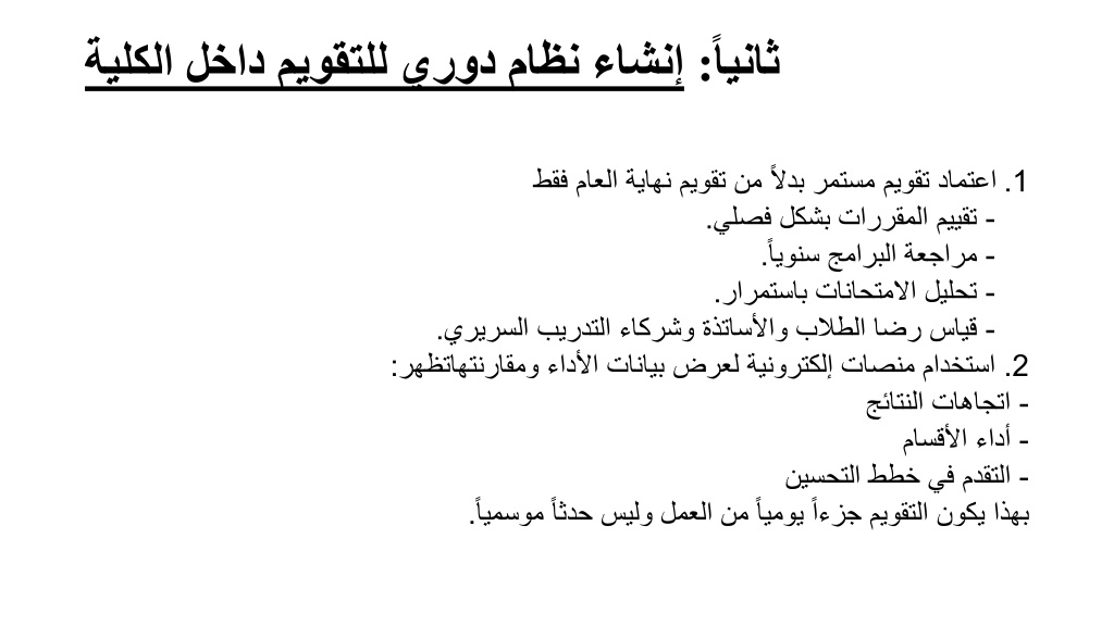 12. ثانياً: إنشاء نظام دوري للتقويم داخل الكلية 1. اعتماد تقويم مستمر بدلاً من تقويم نهاية العام فقط - تقييم المقررات بشكل فصلي. - مراجعة البرامج سنوياً. - تحليل الامتحانات باستمرار. - قياس رضا الطلاب والأساتذة وشركاء التدريب السريري. 2. استخدام منصات إلكترونية لعرض بيانات الأداء ومقارنتهاتظهر: - اتجاهات النتائج - أداء الأقسام - التقدم في خطط التحسين بهذا يكون التقويم جزءاً يومياً من العمل وليس حدثاً موسمياً.
