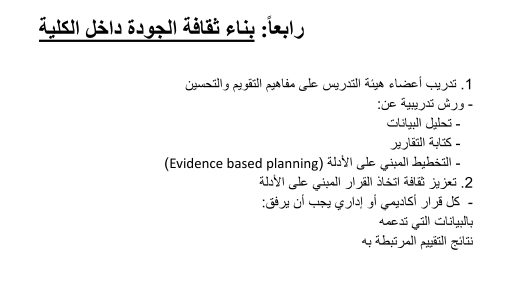 14. رابعاً: بناء ثقافة الجودة داخل الكلية 1. تدريب أعضاء هيئة التدريس على مفاهيم التقويم والتحسين - ورش تدريبية عن: - تحليل البيانات - كتابة التقارير - التخطيط المبني على الأدلة (Evidence based planning) 2. تعزيز ثقافة اتخاذ القرار المبني على الأدلة - كل قرار أكاديمي أو إداري يجب أن يرفق: بالبيانات التي تدعمه نتائج التقييم المرتبطة به