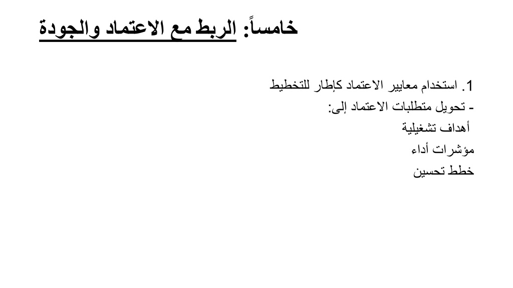 15. خامساً: الربط مع الاعتماد والجودة 1. استخدام معايير الاعتماد كإطار للتخطيط - تحويل متطلبات الاعتماد إلى: أهداف تشغيلية مؤشرات أداء خطط تحسين