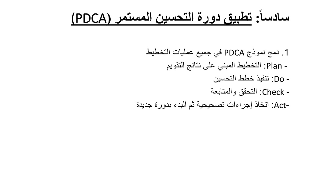 16. سادساً: تطبيق دورة التحسين المستمر ((PDCA 1. دمج نموذج PDCA في جميع عمليات التخطيط Plan - : التخطيط المبني على نتائج التقويم Do -: تنفيذ خطط التحسين Check -: التحقق والمتابعة -Act: اتخاذ إجراءات تصحيحية ثم البدء بدورة جديدة