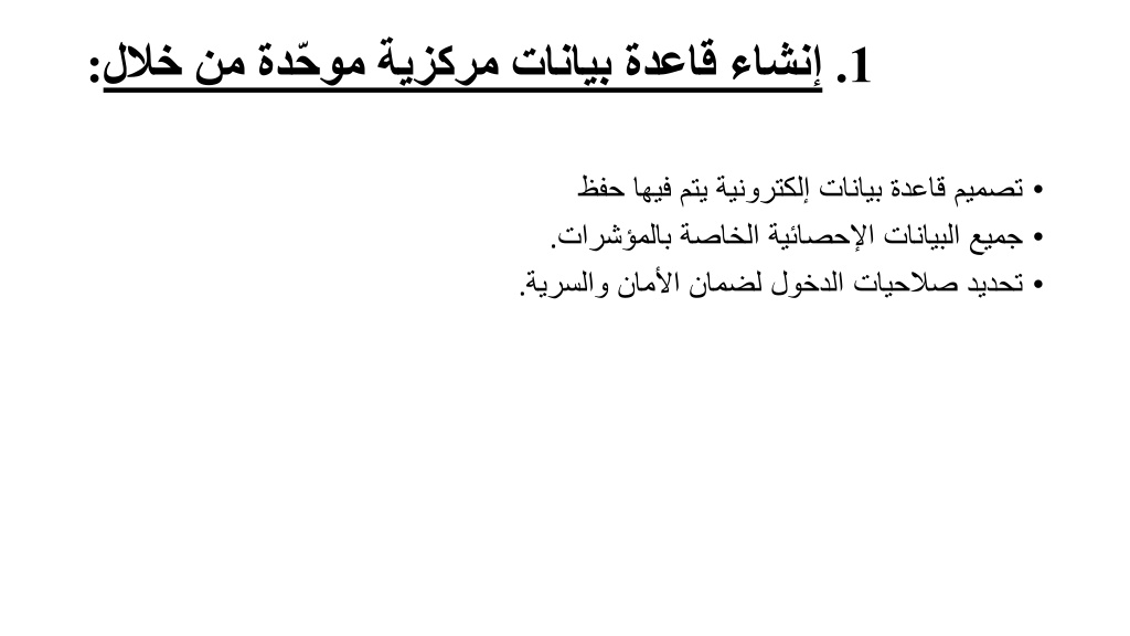 20. 1. إنشاء قاعدة بيانات مركزية موحّدة من خلال: • تصميم قاعدة بيانات إلكترونية يتم فيها حفظ • جميع البيانات الإحصائية الخاصة بالمؤشرات. • تحديد صلاحيات الدخول لضمان الأمان والسرية.