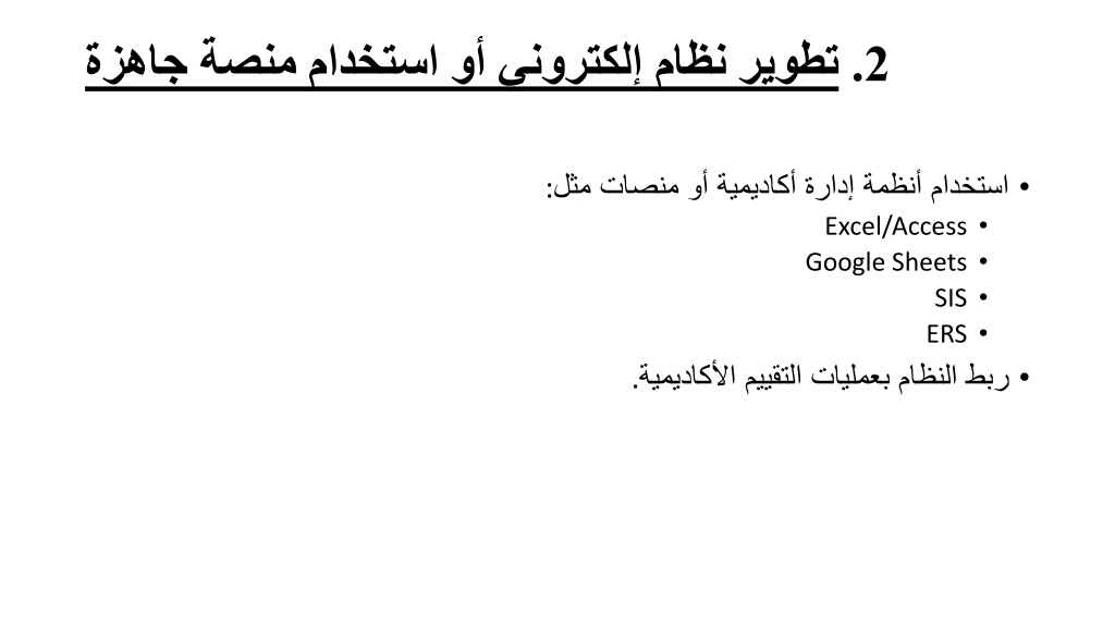 21. 2. تطوير نظام إلكتروني أو استخدام منصة جاهزة • استخدام أنظمة إدارة أكاديمية أو منصات مثل: • Excel/Access • Google Sheets • SIS • ERS • ربط النظام بعمليات التقييم الأكاديمية.