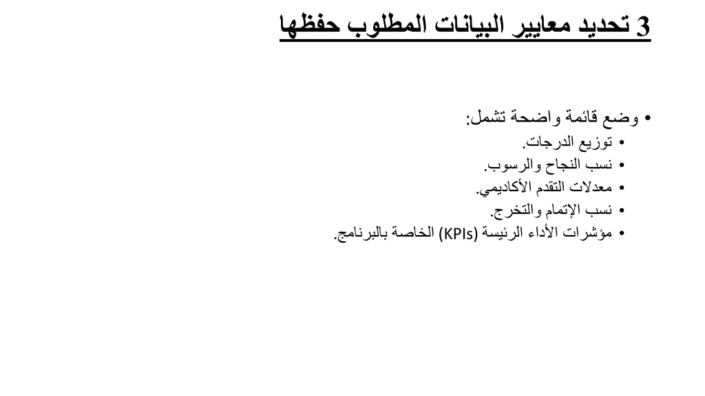 22. 3 تحديد معايير البيانات المطلوب حفظها • وضع قائمة واضحة تشمل: • توزيع الدرجات. • نسب النجاح والرسوب. • معدلات التقدم الأكاديمي. • نسب الإتمام والتخرج. • مؤشرات الأداء الرئيسة (KPIs) الخاصة بالبرنامج.